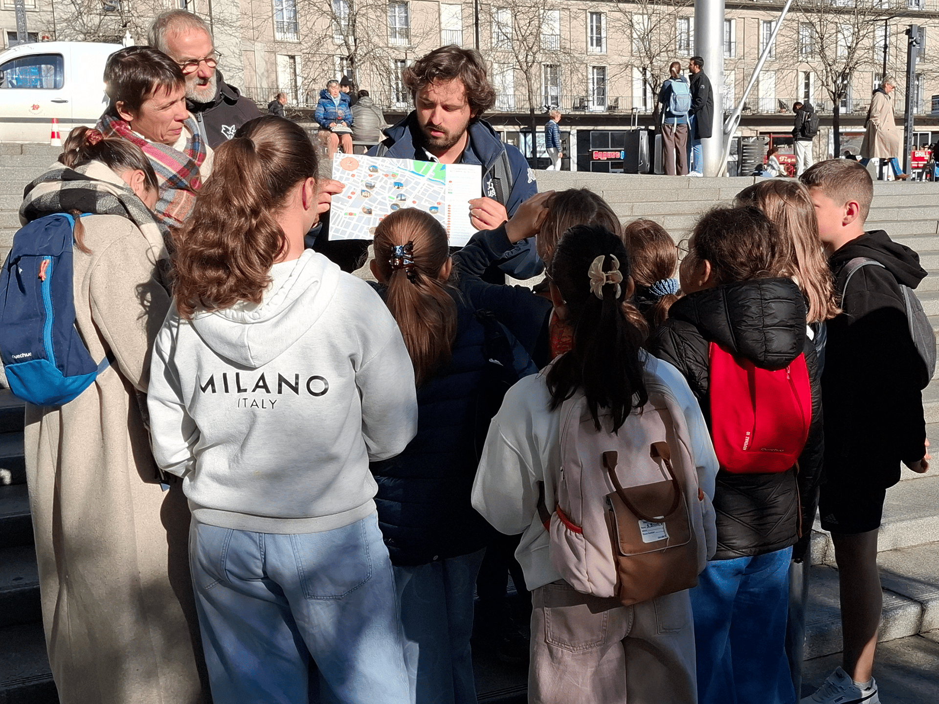 Sur les coups de 10h, le chrono est lancé ! Les enfants partent de la gare et se dirigent vers le premier point de rendez-vous : la statue du Nautipoulpe. Pour cela, ils utilisent la carte mise à leur disposition et cherchent tous les points de repères visuels pour s’orienter. Une fois devant la statue, leur animatrice leur lit un résumé du roman « Vingt Mille Lieues sous les mers » qu’ils doivent bien écouter puisqu’ils devront répondre à trois énigmes plus tard dans le parcours.